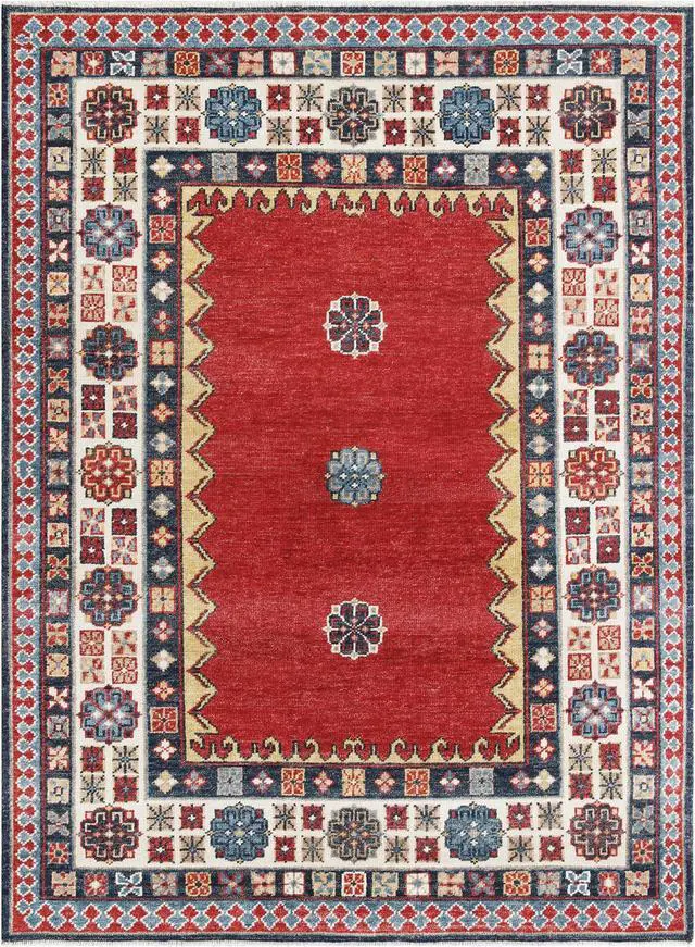 Hand Knotted Wool Rust Traditional Medallion Kazak Rug. Add some warmth to your floors with this stunning hand spuned wool area rug. Place it in your living room to bring some light under heavy furniture. KEY_TAB Taking three or four months to complete this rug was handcrafted by skilled makers using a traditional hand-knotting technique a trade that’s been passed down and preserved for generations.. KEY_TAB Handmade in India from 100% wool with a 0.5 inch pile this rug is great in spaces with heavy foot traffic thanks to its short stature. Hand knotted rug adds style and warmth to a space. This design is centered around a Persian–inspired ornamental medallion and has a certain global appeal. This rug will last you for many years to come under everyday usage and foot traffic. Wool is a stain resistance material by it's nature and is very easy to clean..