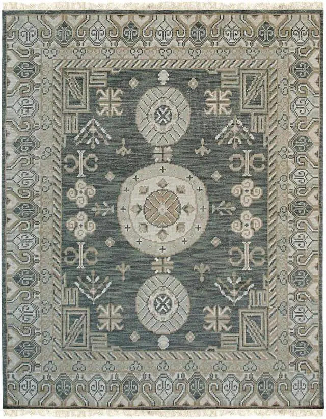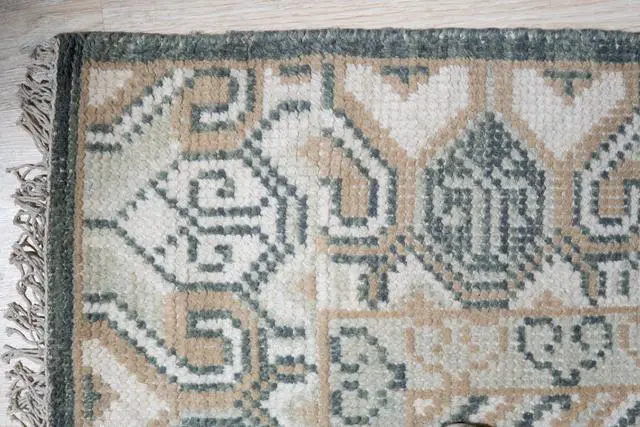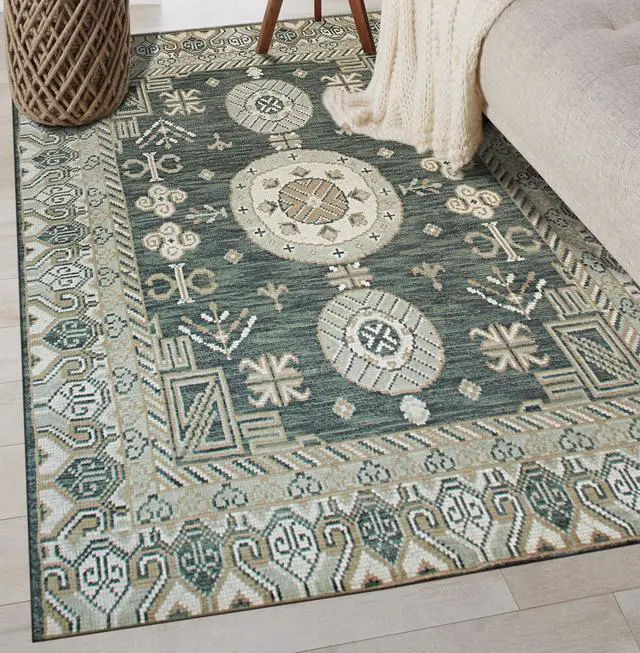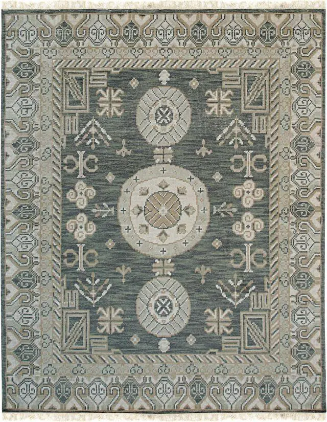 Hand Knotted Wool Green Traditional Oriental Khotan Rug. Hand knotted and meticulously crafted by artisans this stunning Rug Hand Knotted Area Rug will invite quality and beauty into your home or office or outdoor. . KEY_TAB Taking three or four months to complete this rug was handcrafted by skilled makers using a traditional hand-knotting technique a trade that’s been passed down and preserved for generations.. KEY_TAB Handmade in India from 100% wool with a low pile this rug is great in spaces with heavy foot traffic thanks to its short stature. Hand knotted rug adds style and warmth to a space. This design is Khotan style and has a certain global appeal. The rug has a dense soft pile and excellent quality to ensure that you will enjoy the look and feel of your rug for years to come..