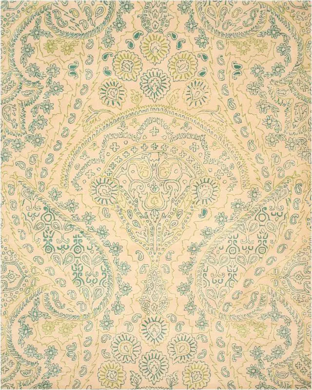 The primary color green adds a refreshing and vibrant touch to the rug making it a versatile centerpiece suitable for various interior styles. The transitional design features intricate paisley motifs characterized by curved teardrop shapes and floral elements creating a visually appealing and timeless look.