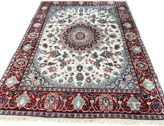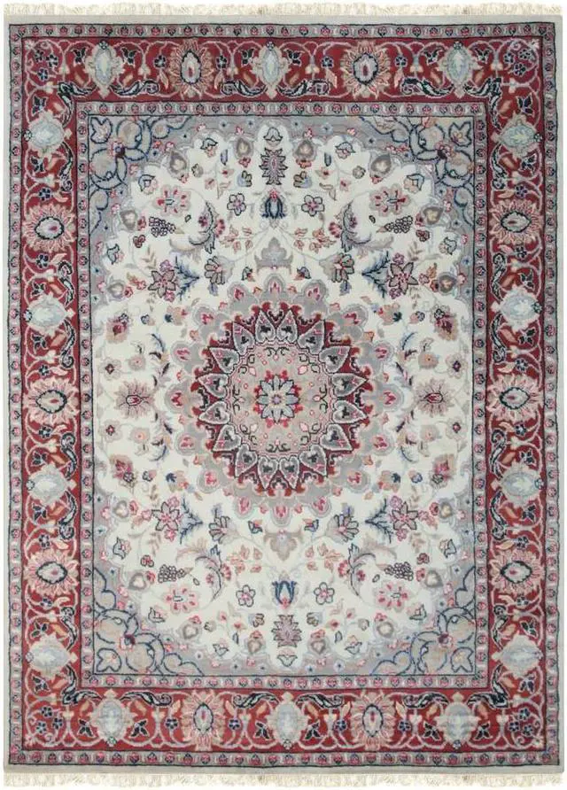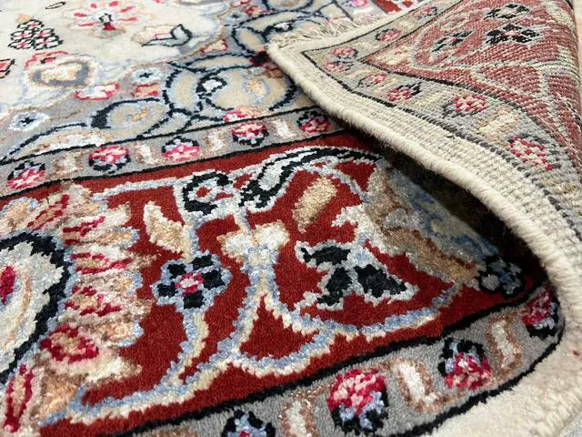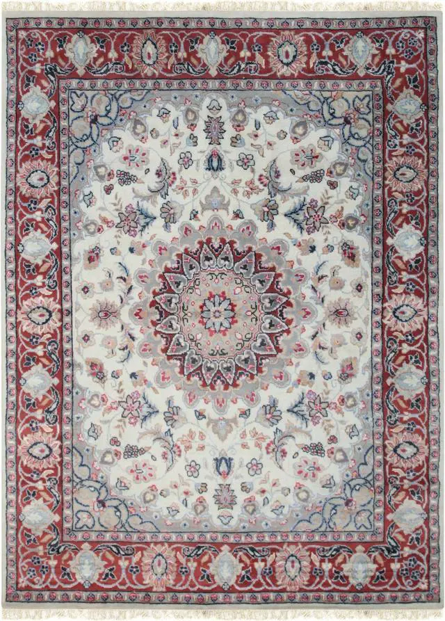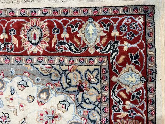 Hand-Knotted Wool/ silk Ivory Traditional Classic Rug. Elevate your space with our luxurious Hand-Knotted Wool/Silk Ivory Area Rug. Meticulously handcrafted with the utmost care and attention to detail this rug combines the timeless beauty of wool with the delicate sheen of silk.. The vibrant Ivory color of this rug instantly commands attention adding a bold and passionate statement to your room. Its rich and intense hue creates a warm and inviting ambiance making it a perfect choice for creating a focal point in your living room bedroom or any space that needs a touch of elegance.. Crafted with exceptional craftsmanship our Hand-Knotted Wool/Silk Ivory Area Rug showcases intricate patterns and designs. Each knot is meticulously tied by skilled artisans ensuring a rug that is not only visually stunning but also built to withstand the test of time.. The combination of wool and silk in this rug offers a luxurious feel underfoot. The wool provides durability natural stain resistance and a soft texture while the silk adds a subtle shimmer and lustrous elegance.. Enhance your decor with the timeless beauty of our Hand-Knotted Wool/Silk Ivory Area Rug. Its fine craftsmanship vibrant color and luxurious materials make it a versatile centerpiece that effortlessly enhances the aesthetic of your space. Invest in the enduring elegance of our Hand-Knotted Wool/Silk Ivory Area Rug. Its exceptional quality striking color and luxurious texture make it a perfect addition to your home. Elevate your interior with this exceptional rug and experience the perfect blend of style and opulence..