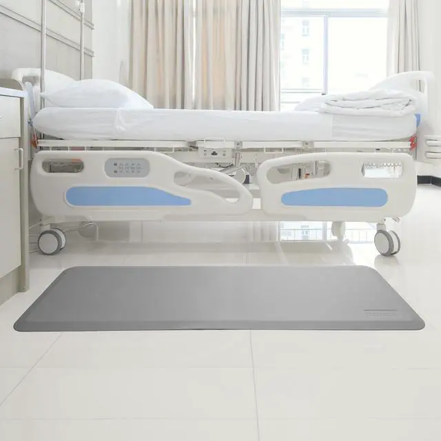 Our bedside fall mat is a comprehensive safety solution designed to minimize the risk of injuries, enhance stability, and provide a comfortable standing surface. Its durable construction, beveled edges, high-impact foam, easy maintenance, and versatile usage make it an excellent choice for various settings and situations where fall prevention and safety are paramount. A durable, slip-resistant rubber backing secures the mat in place on any floor surface including wood, tile, or carpet. This bedside safety mat is designed with a textured cover that provides safe and secure footing.