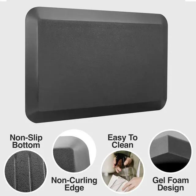 Stand for Longer, Reduce Back StressStanding for long periods can cause discomfort, but our standing mat will keep you comfortable no matter how long youre on your feet. Rubberised gel foam will keep your feet cushioned and keep the blood flowing as you stand. The perfect accompaniment for your new stand up desk. The anti-fatigue mat is designed with a bevelled edge to reduce trip hazards. And an anti slip backing will keep the mat firmly locked in place, so you never need worry about slipping while you work. Can be easily cleaned with a cloth and water, or using a vacuum cleaner.