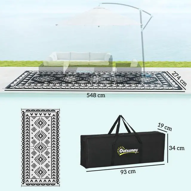 • Outdoor Patio Rug, Large Camping Carpet with Carrying Bag, 9' x 18' Waterproof Plastic Straw, Reversible, Black & White Rhombus Patchwork