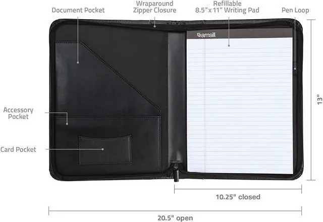 GET ORGANIZED, STAY ORGANIZEDKEY_TAB With dedicated pockets & compartments for letters, loose pages, documents, business cards & personal IDs, it’ s easier than ever for you to get & stay organized. A letter-sized writing pad (letter sized, 8.5 ” x 11” ) with a pen loop takes good care of your emergency note-taking needs.