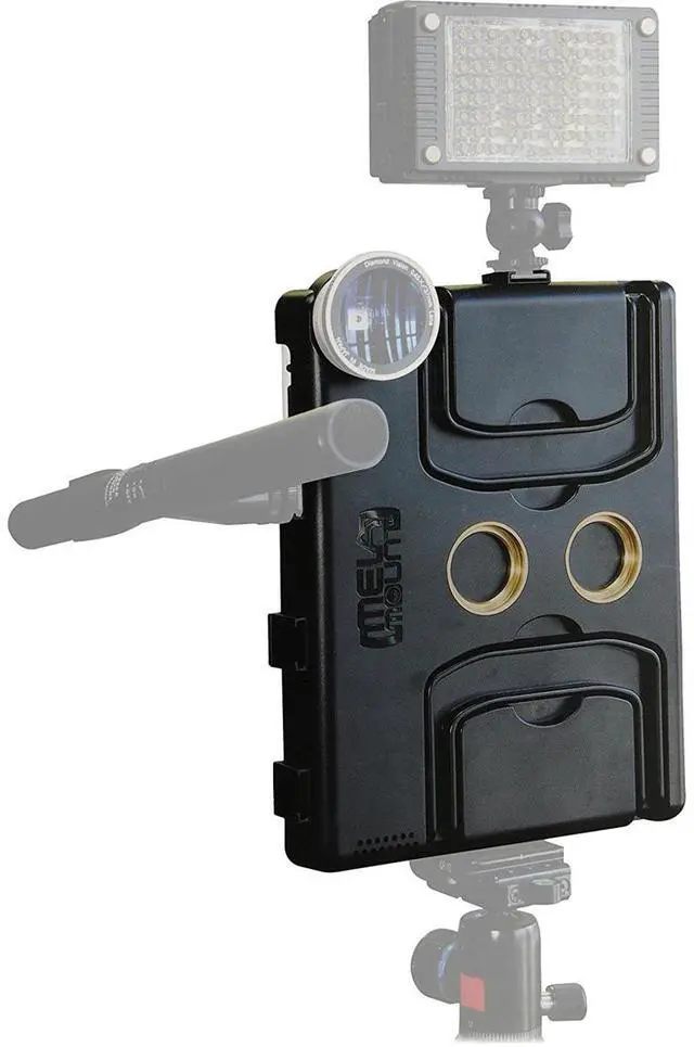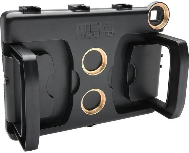 The Melamount Video Stabilizer Pro Multimedia Rig is a rugged and lightweight iPad Air 2 case made of durable ABS plastic. This specialized case securely holds your iPad, offering great protection and versatility while maintaining your ability to record shake-free professional-quality videos. The Melamount has been designed to provide the option to attach many accessories such as auxiliary lenses, video lights, microphones, etc. It supports video both horizontally and vertically.