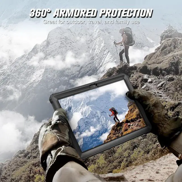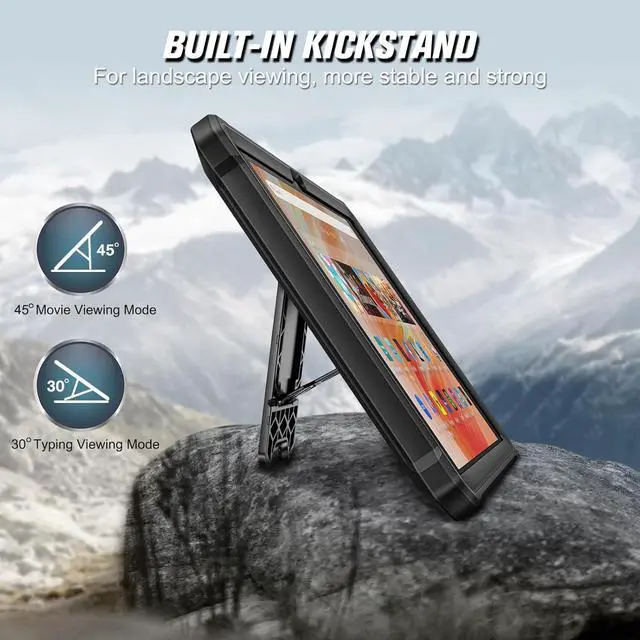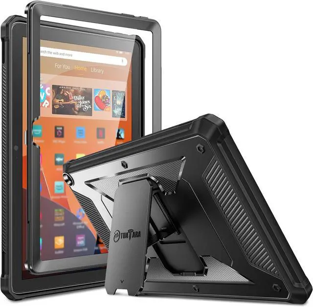 CompatibilitySpecifically designed for All-New Fire HD 10 Tablet (13th Generation 2023 Release) 10.1 ONLY. Will NOT fit any other Kindle or Fire devices. Built-in Screen ProtectorIntegrated front cover screen protector prevents scratches without sacrificing sensitivity or visibility. Built-in KickstandFunctional pop out kickstand allows easy access to your favorite shows movies and games while on the go. Dual-Layer Full ProtectionHybrid soft shock absorption TPU skin & impact-resistant polycarbonate with reptile-like hard shell back cover provide outstanding protection for the ultimate drop defense. Shock Resistant & Dust Proof Enhanced drop protection with extra shock absorption. All features EASILY accessible with case installed.