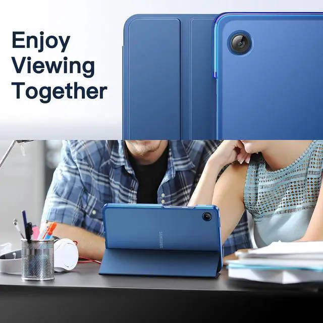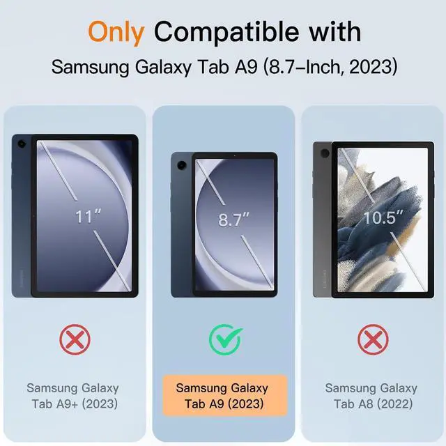 [Exclusively Designed] Compatible with Galaxy Tab A9 8.7 -inch 2023. Please double check the model number before purchasing[Premium Materials] Built with a hard PC back and a soft PU front cover providing necessary protection against daily drops and bumps. The translucent back shows off the original beauty of your device and keeps it slim[Slim & Lightweight] Super slim and lightweight hard back design adds minimal bulk while offers your device great protection[Tri-Fold Stand Cover] The front cover can be folded into a stand to support your tablet in two different positions for viewing and typing[Thoughtful Design] Suitable cutouts for the camera speaker buttons and other ports.