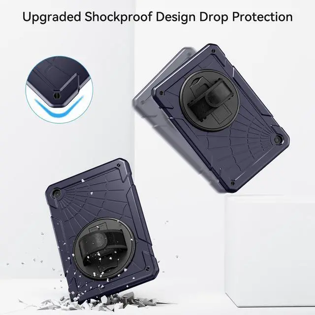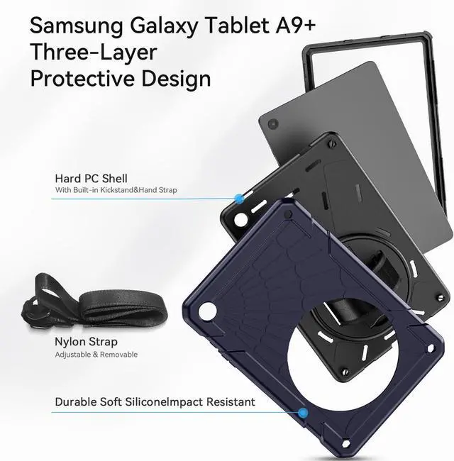 Compatibility- ONLY Fit for Galaxy Tab A9+/ A9 Plus 11 inch 2023 (Model: SM-X210/SM-X216/SM-X218). Please confirm the model (SM-X***) before purchase. Versatile Stand and Handle- 360-degree rotating swivel stand supports position of 3 angles (Vertical Horizontal and Halfway between) ideal for watching videos conferences and travelling. Soft rotating handle strap prevents falling of Galaxy A9+ 11 tablets featuring convenient use for teachers students waiters doctors nurses and conference presenters. Full Protection- Hard PC clamshell with external soft silicone cushion coating and Corner Protection Design offer maximum protection from drop bump shock and optimum comfortable grip. Corner Protection Sturdy Design Hybrid Defender armor anti-slip shock-absorption triple layers. Precise cutout design easy access to buttons ports cameras and speakers without removing the case. Convenient and Detachable Shoulder Strap- Adjustable shoulder grip can be slanted and release your hands completely. This function is perfect for traveling restaurant ordering home product introduction engineering outdoor operations teaching etc. Also the strap allows you to hang up your tablet behind the car seat for entertainment for kids. Sale Services- Stweap offers after-sale services ensuring that you can use your device with confidence and that any issues are addressed as soon as possible. Safeguard your Galaxy Tab A9 Plus/ A9+ with the Stweap tablet case the combination of functionality and style!