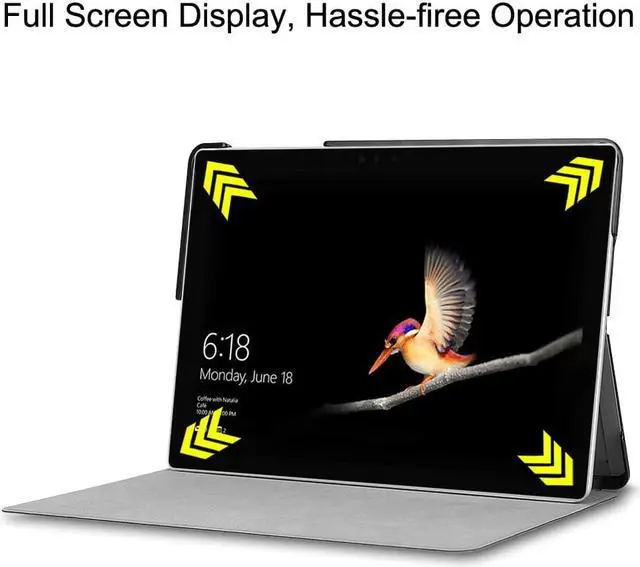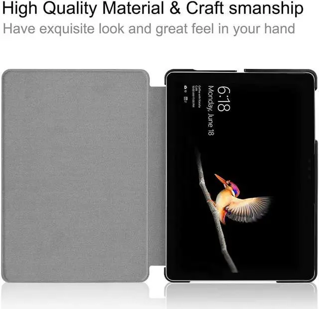 -Slim lightweight durable protective hardback with Premium Synthetic Leather with Soft scratch-free microfiber interior combine with rigid poly-carbonate back shell brings you a solid case -Specifically-cut for access to all buttons and ports, Prevents scratches and damages to your Microsoft Surface Go. -Slim leather folio cover case with a stable stand for comfortable viewing; Easy to open and close with a Folding magnetic; With build in pen holder.