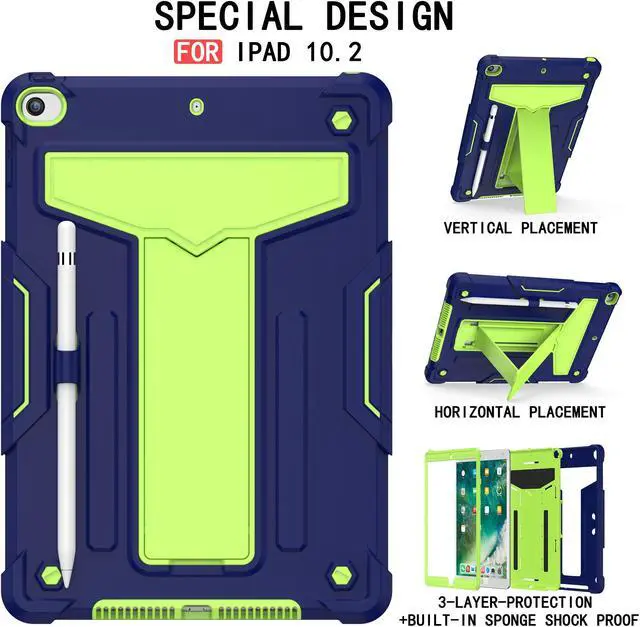 EpicGadget Case for iPad 10.2 (9th/8th/7th Gen) 2021/2020/2019, Protective Rugged Hybrid Case with Kickstand Pencil Holder Cover Case for Apple 10.2 inch iPad 9th/8th/7th Generation - Navy Blue/Green