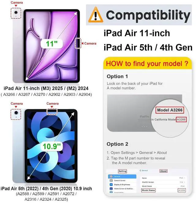 Compatibility: Designed for iPad Air 7th/6th Generation 11 Inch M3 M2 2025 2024 (A3266, A3267, A3270, A2902, A2903, A2904), iPad Air 5th/4th Generation 10.9" 2022 2020 (A2588, A2589, A2591, A2316, A2324, A2325, A2072), iPad Pro 11 4th Gen 2022 (A2435 A2761 A2762), 3rd Gen 2021 (A2301 A2377 A2459 A2460), 2nd Gen 2020 (A2228 A2231 A2068 A2230), 1st Gen 2018 (A1980 A2013 A1934 A1979). Not fits for iPad Pro 11 M4 2024 Model. Please check your model before purchasing