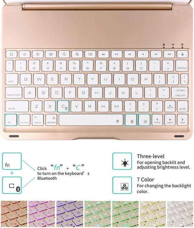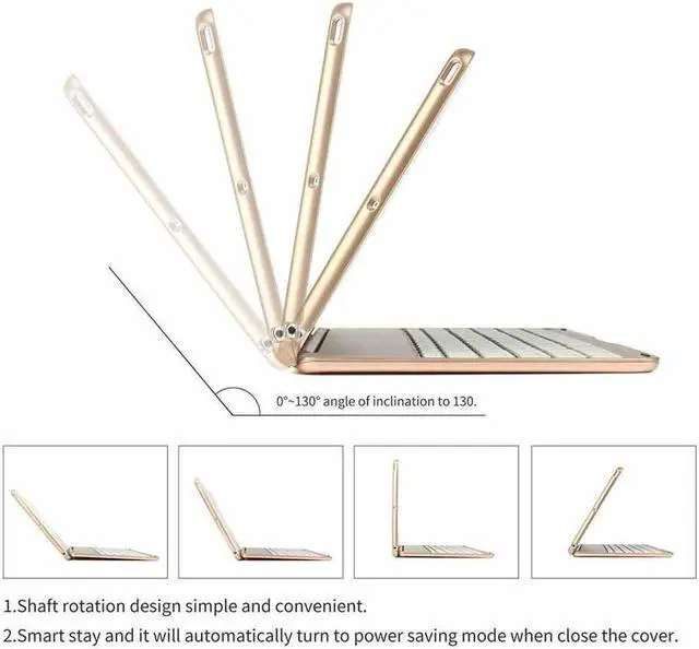 Bluetooth New Keyboard: This apple keyboard hard case have 7 colors backlighting options, different brightness control, makes the iPad keyboard works and looks great in dark, provide a different visual enjoyment and comfortable typing experience for you. Ajustable 135 Degree Rotation and