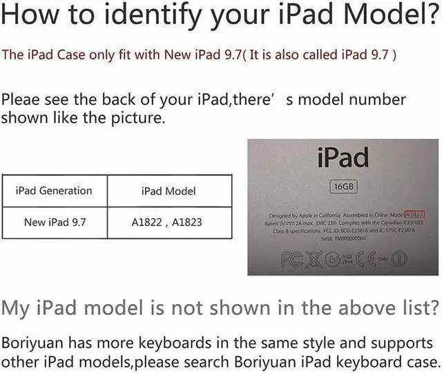 Warranty and Customer Service: Once you have the apple keyboard case cover, your ipad can be used as a laptop wherever in office, bedroom or kitchen. Werleo provides you with 24-hour email contact service & 1-year worry-free warranty & 30-day money-back guarantee. Except the keyboard case, you will get a ipad keyboard protector and 1 stylus for free. Werleo Aluminum 7 Color new 9.7 ipad case hard shell for iPad 9.7 2017 2018 released (A1822/A1823) / iPad AIR (A1474/A1475/A1476). On the back of the tablet, near the bottom, you will find the Model of your iPad.