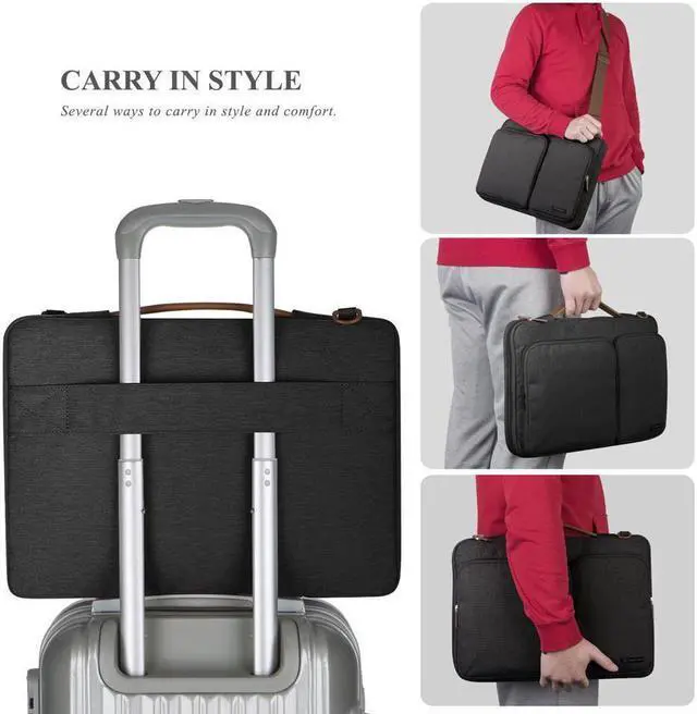 PORTABLE DESIGN -- You can carry this laptop bag in more styles and comfort: (1) On hand by wide soft leather handle;(2) On shoulder or crossbody by by detachable adjustable well-padded shoulder strap;(3) Over trolley suitcase by sturdy luggage strap.