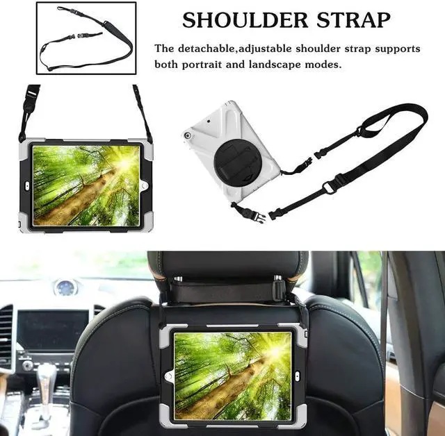 The shoulder belt is adjustable and removable. Your tablet can be slung diagonally or slung over one shoulder, even hung in front of your backseat. Let your backseat passengers enjoy convenient tablet viewing from the back of your car's headrest posts.