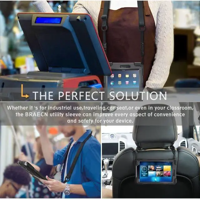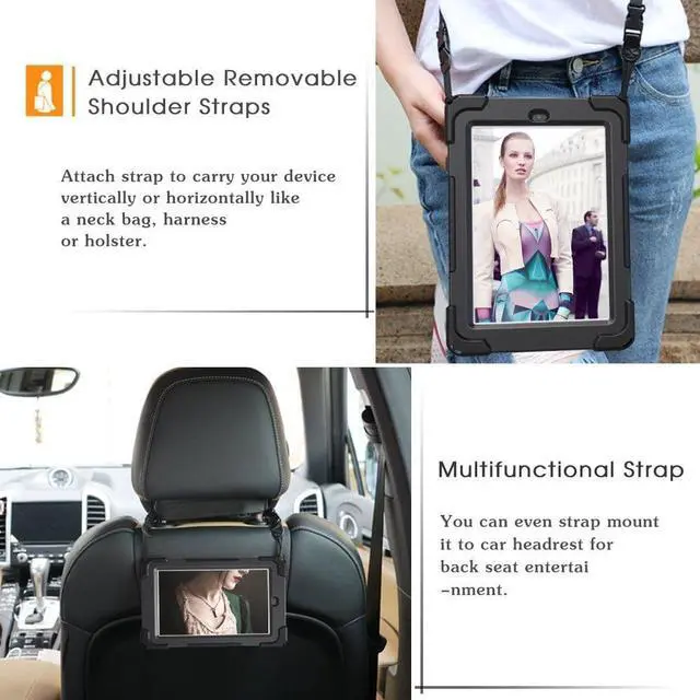 360 degrees rotatable kickstand & The adjustable hand strap & Adjustable removable shoulder straps . Attach strap to any two holes to carry your device vertically or horizontally like a messenger bag / neck bag / sling / harness or holster.allows you to display your tablet behind one seat for personal viewing or between two seats for shared viewing