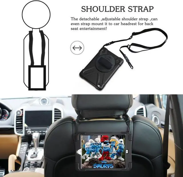 Adjustable removable shoulder straps . Attach strap to any two holes to carry your device vertically or horizontally like a messenger bag / neck bag / sling / harness or holster.allows you to display your tablet behind one seat for personal viewing or between two seats for shared viewing