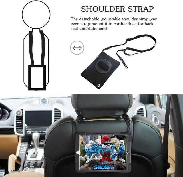 Adjustable removable shoulder straps . Attach strap to any two holes to carry your device vertically or horizontally like a messenger bag / neck bag / sling / harness or holster.allows you to display your tablet behind one seat for personal viewing or between two seats for shared viewing