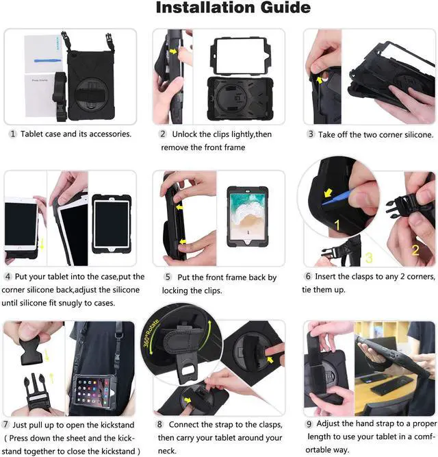 Flexible Nylon Shoulder Strap: By attaching strap to any two corners and adjusting to a comfortable length, your tablet can be carried vertically or horizontally in a more secure way during hiking, traveling or other outdoor activities. Also, strap allows you to hang up your tablet behind car seat for iPad entertainment for kids.