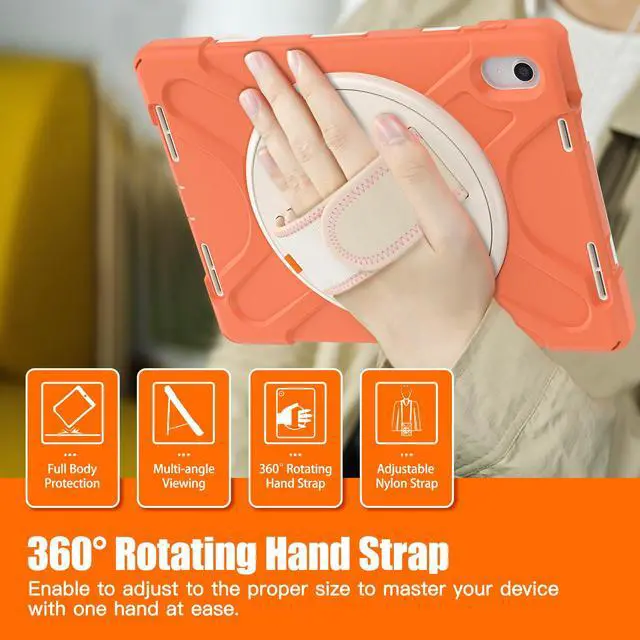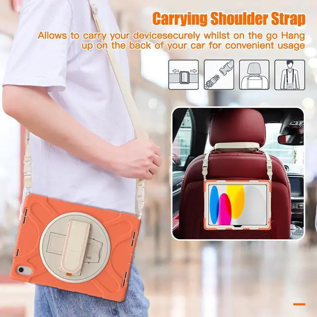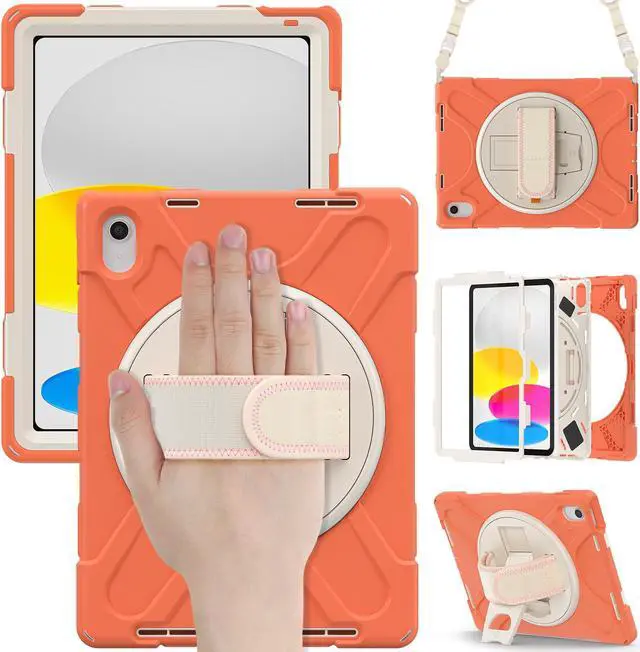 iPad 10th Generation Case 2022 10.9 Inch Model A2696 A2757 A2777 Shockproof Cover with Pencil Holder Stand Hand Strap Shoulder Belt Orange