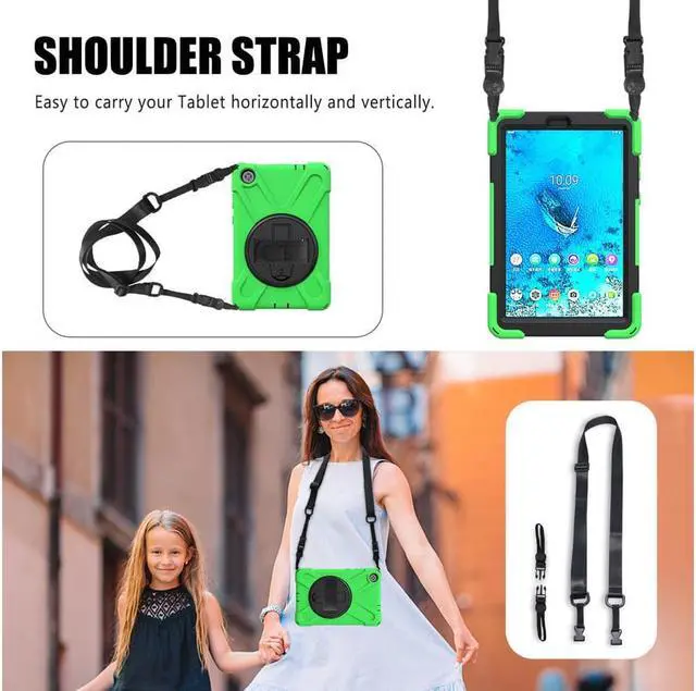 2-IN-1 HANDLE & STAND + REMOVABLE SHOULDER STRAP - 360 degree rotating waterproof material hand strap, helps for holding the tablet while on the movie. Handle folds into upright stand for watching movies or improved typing angle. Box includes expandable & detachable shoulder strap. Straps attach to holes forming carrying case like messenger bag / neck bag / sling / harness or cross body holster. You can even strap mount to car headrest for back seat entertainment