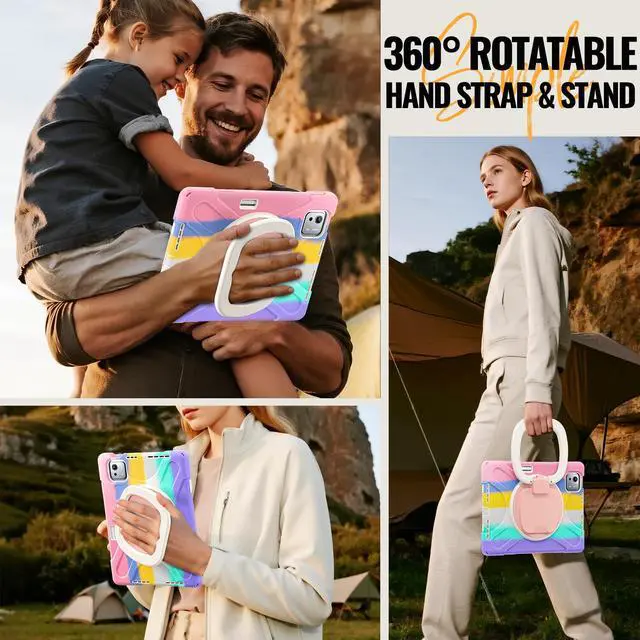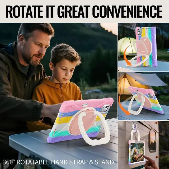 360° ROTATABLE STAND & HAND STRAP - 360°Rotatable foldable stand offers multiple angles for enjoying the most comfortable keyboard-typing, movie-viewing or draw. This sturdy kickstand can be folded when you don't need it. Ergonomically 360°Rotatable adjustable hand strap makes you hold or use your tablet easily in all directions, adjustable velcro hands strap allows big hand and small hand, perfect for kids and adults.