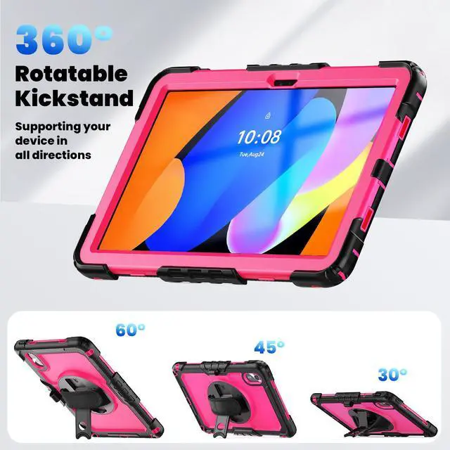 The back cover with built-ina folding kickstand is hidden inside. When the kickstand is extended, it can be rotated 360 degrees with the turntable to achieve different stand angles.You will have the stable angle for movie-viewing, typing, reading or face-to-face chattin.