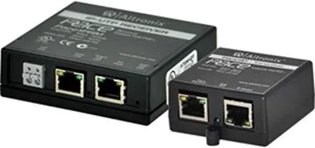 Pace1STR is a long range Ethernet adapter kit which transmits data at 100mbps full duplex and power via Cat5e or higher cable in a PoE(+) compliant format. The Pace1PRM receiver is powered via a PoE midspan such as the Altronix Netway series or by an endspan. The receiver passes the PoE(+) compliant power over the cable to the Pace1ST mini transceiver which in turn passes this power to an enabled IP camera/device. These plug and play units facilitate cost effective solutions for IP devices that need to be installed at distances greater than 100m.