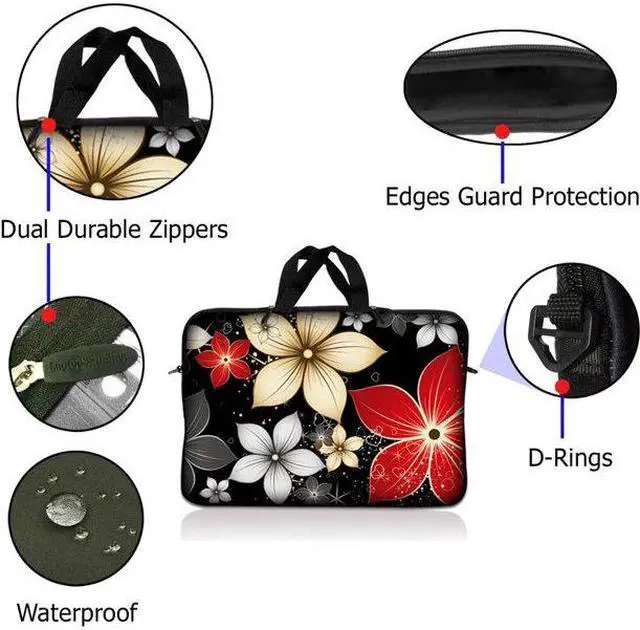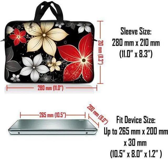 LSS 10.2 inch Laptop Sleeve Bag Carrying Case Pouch with Handle for 8" 8.9" 9" 10" 10.2" Apple Macbook, GW, Acer, Asus, Dell, Hp, Sony, Toshiba, Black Gray Red Flower Leaves