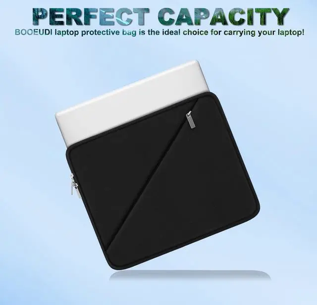 This laptop case comfortably fits a 15.6-inch laptop. Additional front zippered pocket for charging, mouse, cable, phone, storage card, external hard drive, pen, 9.7-inch iPad, and more. The BOOEUDI laptop protective bag is the ideal choice for carrying laptops!