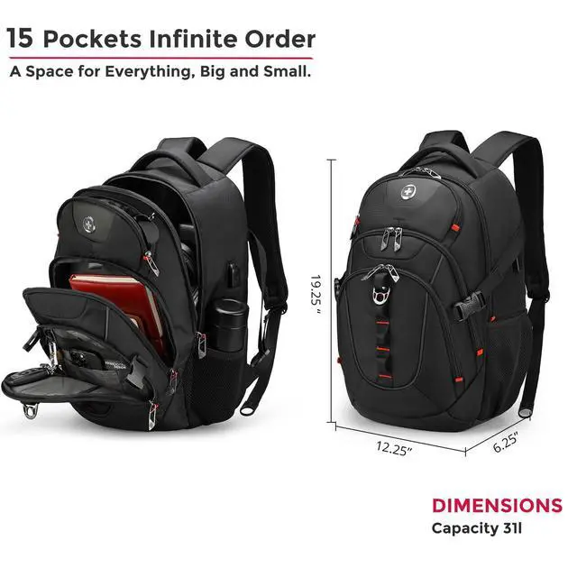 • Multiple Pockets: This computer backpack features a multi-layered storage system including 1 front and 2 side quick-access pockets for on-the-go items. This bookbag also comes with a luggage strap, letting you attach it to suitcases for one-handed pulling during travel