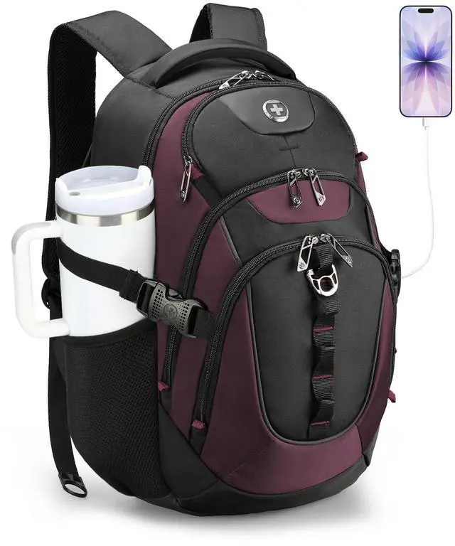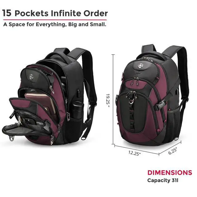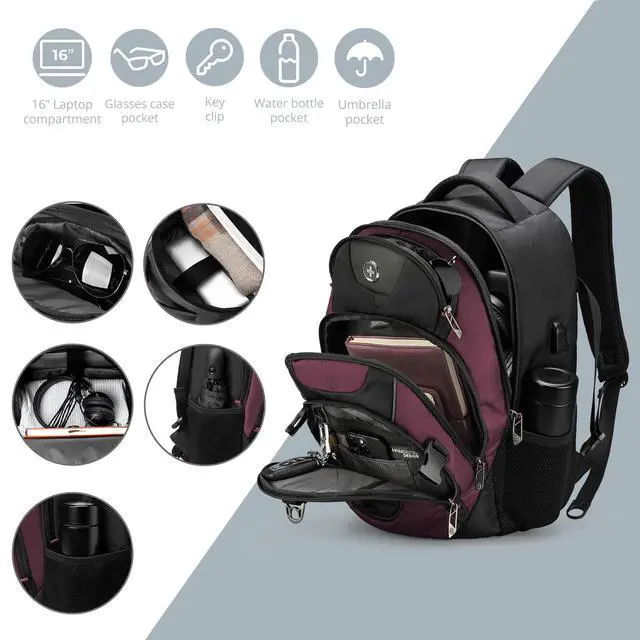 • Multiple Pockets: This computer backpack features a multi-layered storage system including 1 front and 2 side quick-access pockets for on-the-go items. This bookbag also comes with a luggage strap, letting you attach it to suitcases for one-handed pulling during travel