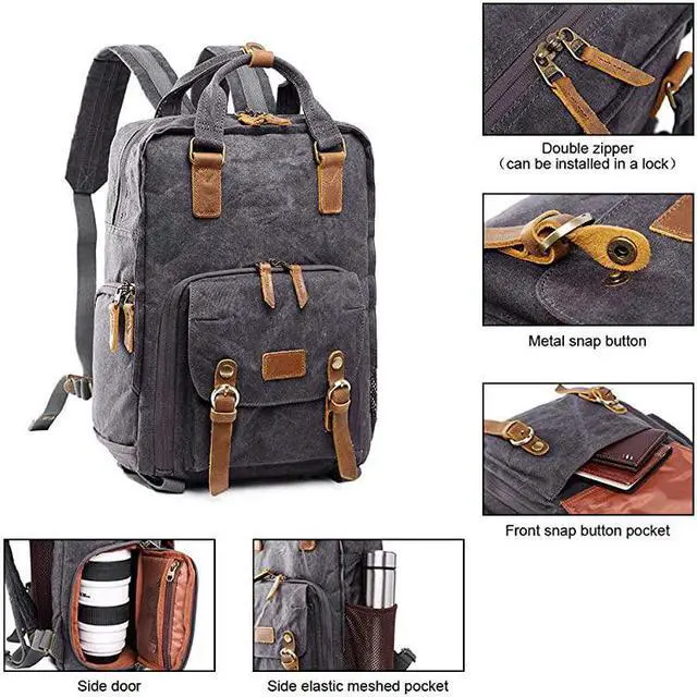 *****Large capacity multi-pocket design: 1 front snap button pocket, 1 front zipper pocket, 1 side elastic meshed pocket (can hold umbrella or bottle), 2 inside zipper meshed pocket, 1 laptop compartment (fits up to 14-inch laptop)***** *****The padded insert camera organizer comes with 3 removable and adjustable cushions. It can be constructed into many small partitions, each of which can house a standard zoom lens. It can protect the fragile things like camera, lens, flashlight and