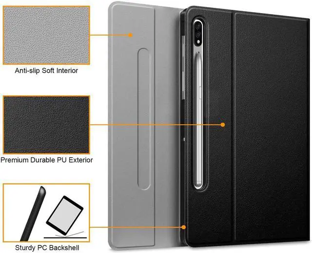 Durable PU leather cover and anti-slip rubber-lined interior provide full protection for your tablet. Premium polycarbonate shell locks your tablet in place and absorbs drops and bumps