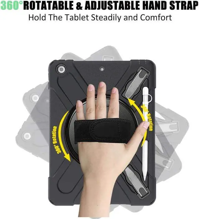 Ajustable Shoulder Strap And Hand Strap: The armor heavy duty rugged hard nonslip iPad Case comes with a detachable and attachable shoulder strap,so you can carry the tablet on neck or shoulder like a bag and sling it on car head rest. The handle hand grip is also adjustable, which allows you to securely grip your iPad with one hand.
