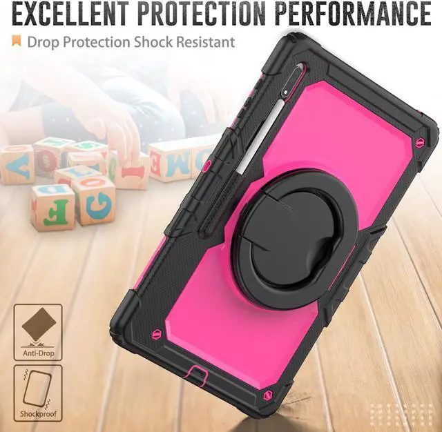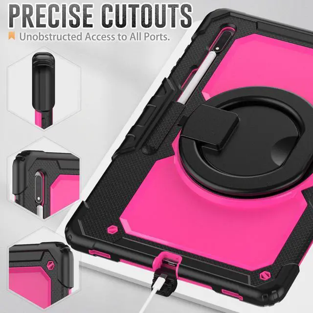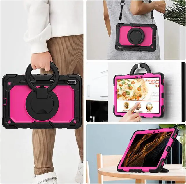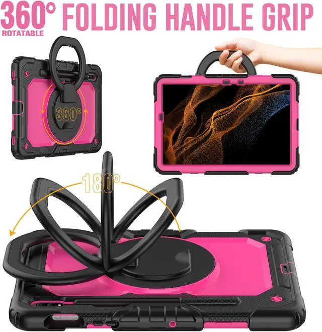360° Rotatable Kickstand & Hand Strap: 360 degree rotatable kickstand offers multiple angles for viewing, typing and reading. Ergonomic and adjustable back handle allows you to grip your tablet securely and steadily with one hand, worry-free from dropping it