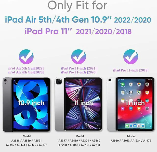 Perfect Compatibility: Only Compatible with iPad Air 5 2022 [iPad Air 5th Generation Case] (Model: A2588 A2589 A2591), iPad Air 4 10.9 inch 2020 [iPad Air 4th Generation Case] (Model: A2072 A2316 A2324 A2325), also fits iPad Pro 11 inch 4th Gen 2022(Mdoel: A2435 / A2761 / A2762), iPad Pro 11 3rd Generation 2021 (Model: A2301 A2377 A2459 A2460), iPad Pro 11 2nd Generation 2020 (Model: A2228 A2231 A2068 A2230) & iPad Pro 11 1st Generation 2018 (Model: A1980 A2013 A1934 A1979). NOT work for any other iPad models. Please check back bottom of your iPad to find the model number.