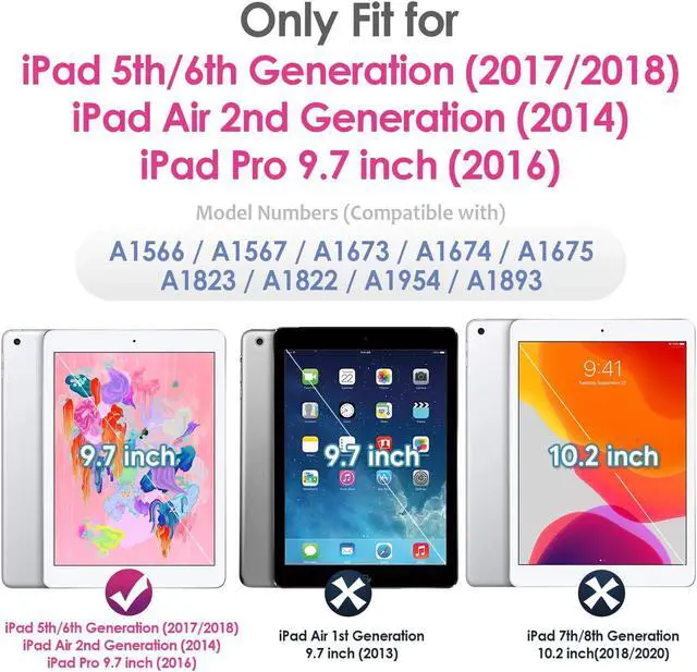 Perfect Compatibility: This case is compatible with iPad 9.7 inch 2018 6th Generation (Model: A1893/A1954), iPad 9.7 inch 2017 5th Generation (Model: A1822/A1823), iPad Air 2 2014 Released (Model: A1566/A1567) and iPad Pro 9.7" 2016 Released (Model: A1673/A1674/A1675). Note: This Case Can Not fit for iPad Air 1 2013 Released (Model: A1474/A1475/A1476)