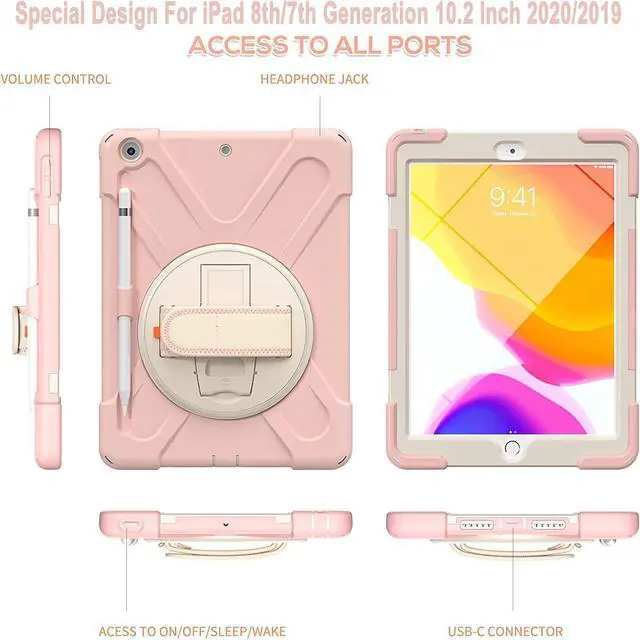 FEATURES: 1- Built-in Kickstand is 360 degree rotating, you can adjust your 10.2 inch iPad to whatever angle you want, perfect for watching videos and chatting; 2- Built-in elastic Pencil Holder makes it easy to pull out and store your Apple pencil store your Apple Pencil 3- Adjustable velcor hand strap allows big hand and small hand, perfect for kids and adults. 4- Adjustable and detachable Shoulder belt is very convenience, safe and fashion you can carry tablet with should belt wherever you want