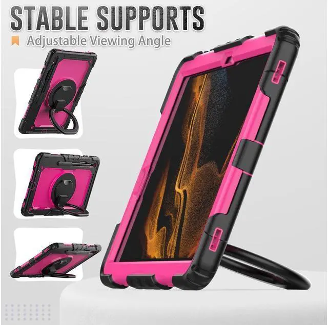 360° Rotatable Kickstand & Hand Strap: 360 degree rotatable kickstand offers multiple angles for viewing, typing and reading. Ergonomic and adjustable back handle allows you to grip your tablet securely and steadily with one hand, worry-free from dropping it