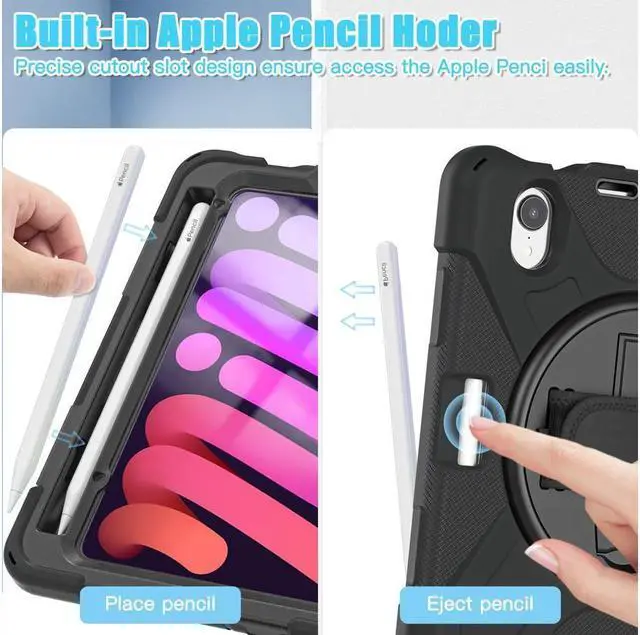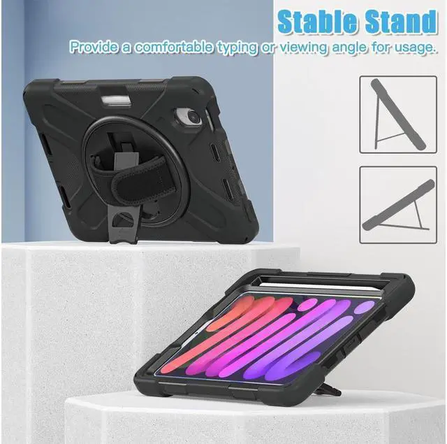 • Built-in Kickstand is 360 degree rotating, you can adjust your iPad Mini 6/mini 7 to whatever angle you want, perfect for watching videos and chatting;