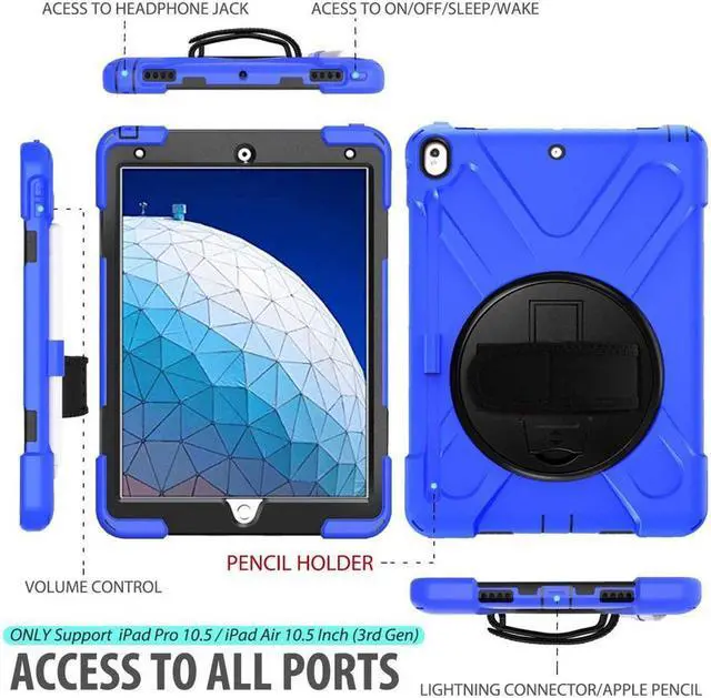 [360 Degree Rotating Stand]: On the back side of the high impact resistant plastic bumper iPad Pro 10.5 inch case there is a sturdy 360° swivel foldable kickstand.Convenient for watching videos,conferences, travelling.