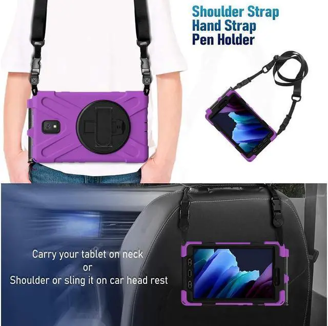 2-IN-1 HANDLE & STAND + REMOVABLE SHOULDER STRAP - 360 degree rotating hand strap, helps for holding the tablet while on the movie. Handle folds into upright stand for watching movies or improved typing angle. Box includes expandable & detachable shoulder strap. Straps attach to holes forming carrying case like messenger bag / neck bag / sling / harness or cross body holster. You can even strap mount to car headrest for back seat entertainment!
