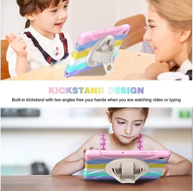360° ROTATING STAND AND WASH STRAP: Built-in 360 degree rotating wrist strap and kickstand on the back, flexible vertically and horizontally and any other multiple angles, ideal ideal for watching movies, reading or teaching, free your hand to the greatest extent! Adjustable handle strap, use perfectly suitable for all hand sizes, adults, women, students, children.