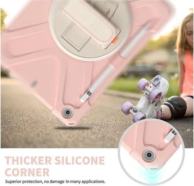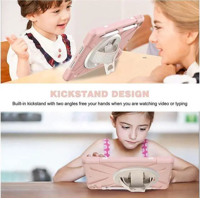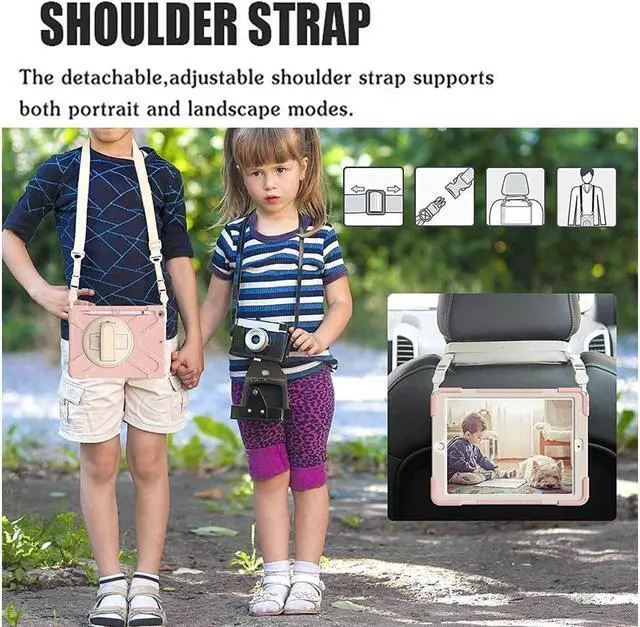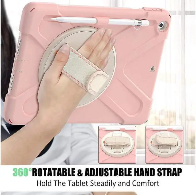 FEATURES: 1- Built-in Kickstand is 360 degree rotating, you can adjust your 10.2 inch iPad to whatever angle you want, perfect for watching videos and chatting; 2- Built-in elastic Pencil Holder makes it easy to pull out and store your Apple pencil store your Apple Pencil 3- Adjustable velcor hand strap allows big hand and small hand, perfect for kids and adults. 4- Adjustable and detachable Shoulder belt is very convenience, safe and fashion you can carry tablet with should belt wherever you want