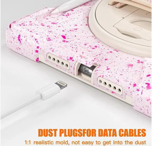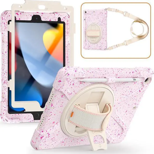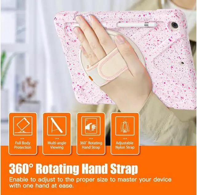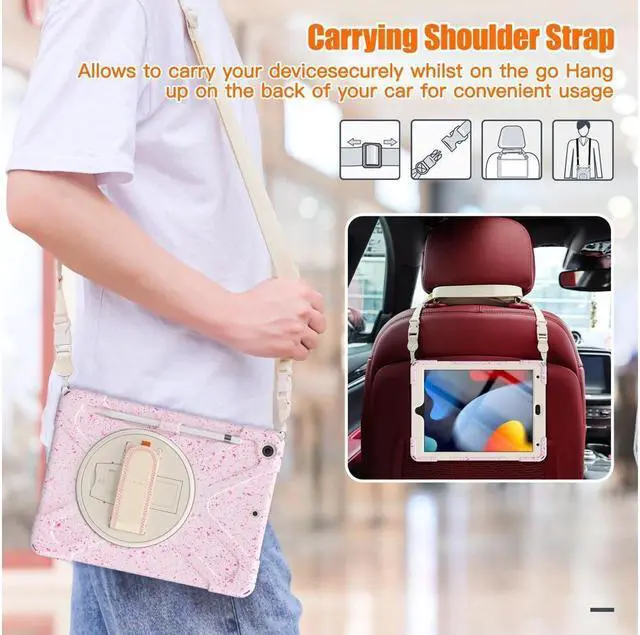 FEATURES: 1- Built-in Kickstand is 360 degree rotating, you can adjust your 10.2 inch iPad to whatever angle you want, perfect for watching videos and chatting; 2- Built-in elastic Pencil Holder makes it easy to pull out and store your Apple pencil store your Apple Pencil 3- Adjustable velcor hand strap allows big hand and small hand, perfect for kids and adults. 4- Adjustable and detachable Shoulder belt is very convenience, safe and fashion you can carry tablet with should belt wherever you want