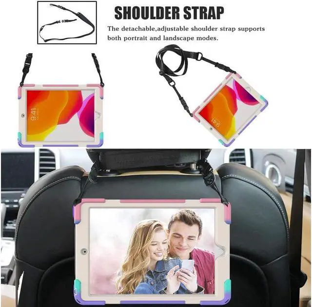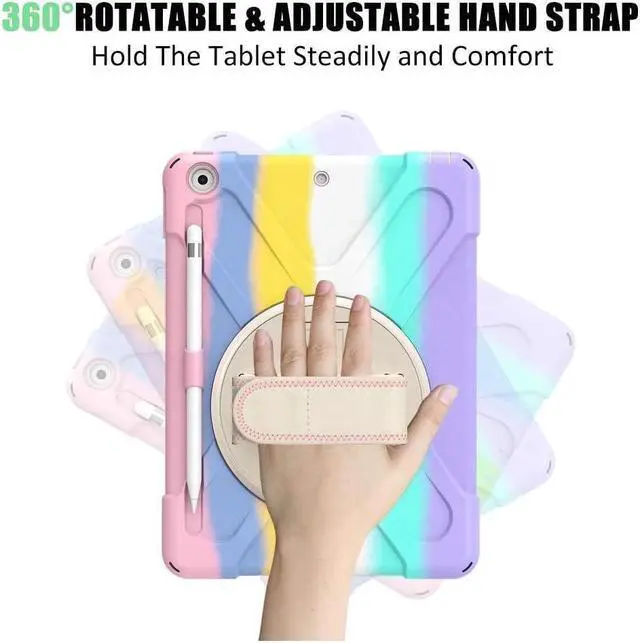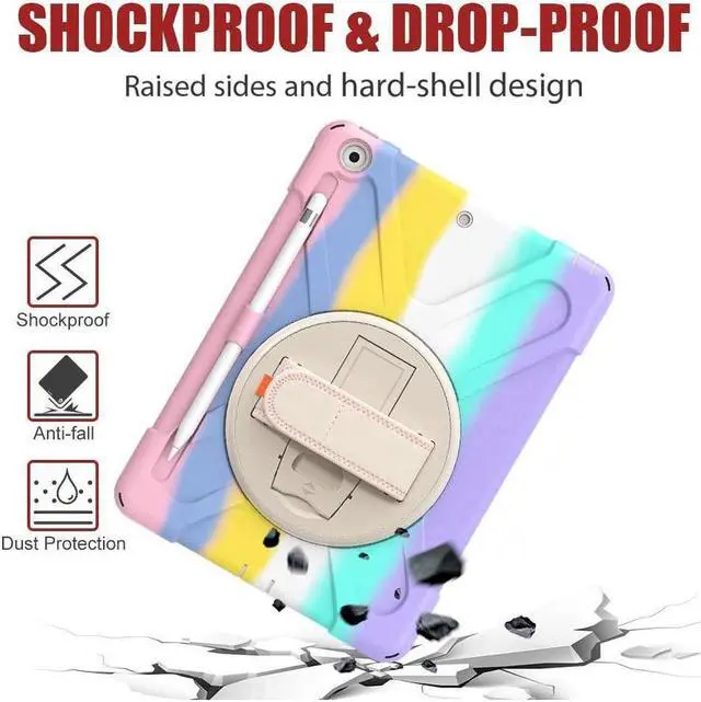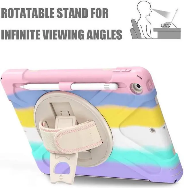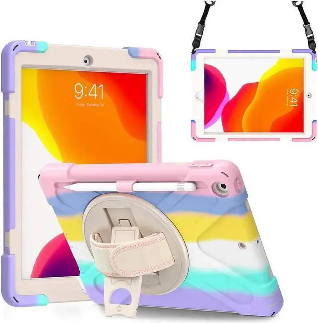 FEATURES: 1- Built-in Kickstand is 360 degree rotating, you can adjust your 10.2 inch iPad to whatever angle you want, perfect for watching videos and chatting; 2- Built-in elastic Pencil Holder makes it easy to pull out and store your Apple pencil store your Apple Pencil 3- Adjustable velcor hand strap allows big hand and small hand, perfect for kids and adults. 4- Adjustable and detachable Shoulder belt is very convenience, safe and fashion you can carry tablet with should belt wherever you want
