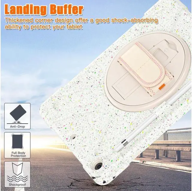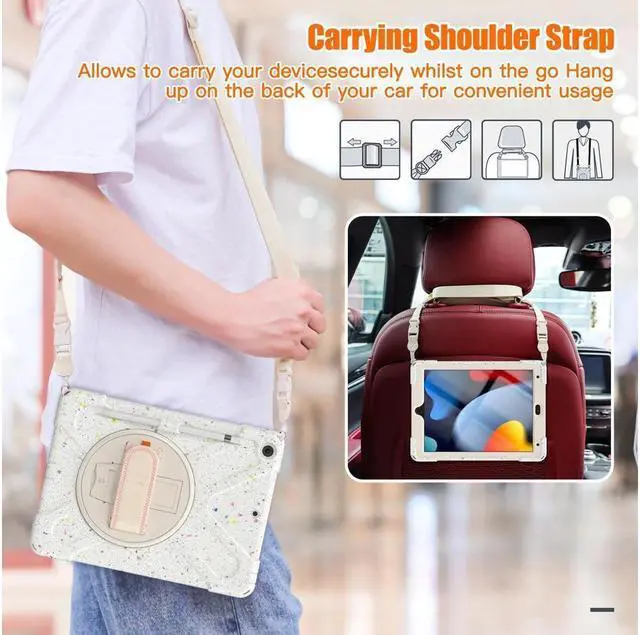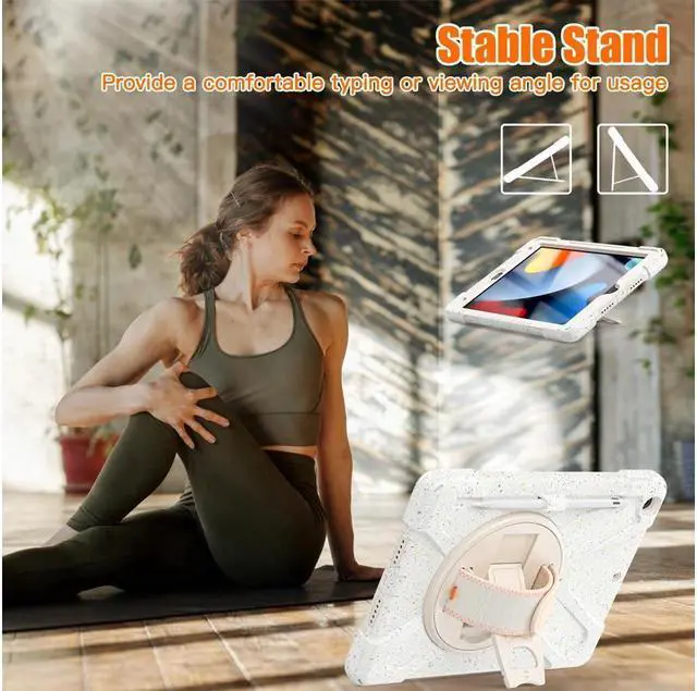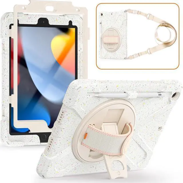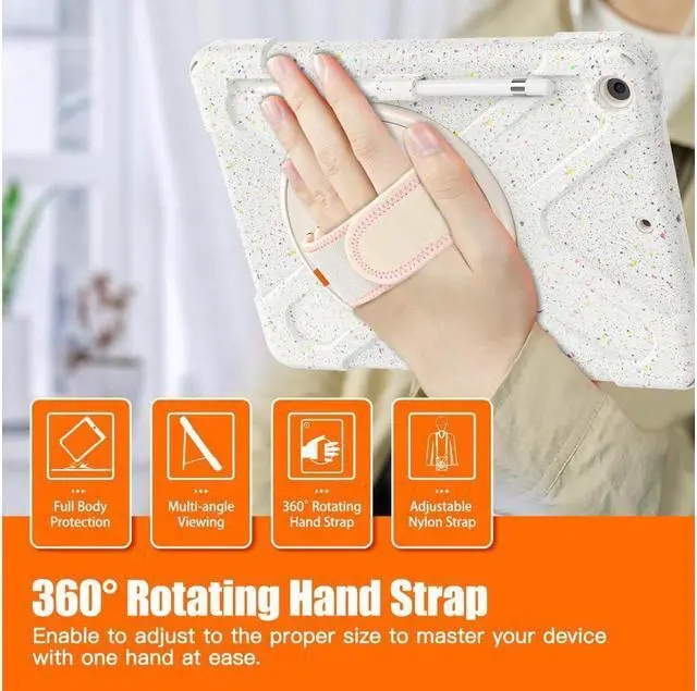 FEATURES: 1- Built-in Kickstand is 360 degree rotating, you can adjust your 10.2 inch iPad to whatever angle you want, perfect for watching videos and chatting; 2- Built-in elastic Pencil Holder makes it easy to pull out and store your Apple pencil store your Apple Pencil 3- Adjustable velcor hand strap allows big hand and small hand, perfect for kids and adults. 4- Adjustable and detachable Shoulder belt is very convenience, safe and fashion you can carry tablet with should belt wherever you want