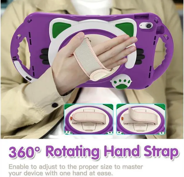 Built-in 360 degree rotating kickstand and adjustable hand strap provide a more flexible and convenient way to use your iPad, ideal for boys,girls,children.
