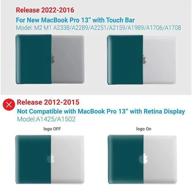 Please kindly check the model number "Axxxx" on the back of the laptop before purchase, make sure you choose the exact same model number as the listing title stated "A2338" or "A2289" or "A2251" or "A2159" or "A1989" or "A1706" or "A1708". Case dimension: 12 x 8.5 x 0.6 inch, compatible with MacBook Pro 13 inch with/without Touch Bar and Touch ID dimension: 11.97 x 8.36 x 0.59 inch (2016 2017 2018 2019 2020 2021 2022 Release). NO Cut Out design, transparency is different from color to color.